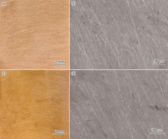 Surface morphologies of TP2 Cu-alloy soaked in 55% ethylene glycol aqueous solution for 30 d: (a, b) uncoupled sample, (c, d) coupled sample