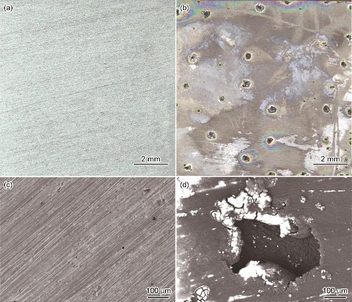 Surface morphologies of AA1060 Al-alloy soaked in 55% ethylene glycol aqueous solution for 30 d: (a, b) uncoupled sample, (c, d) coupled sample