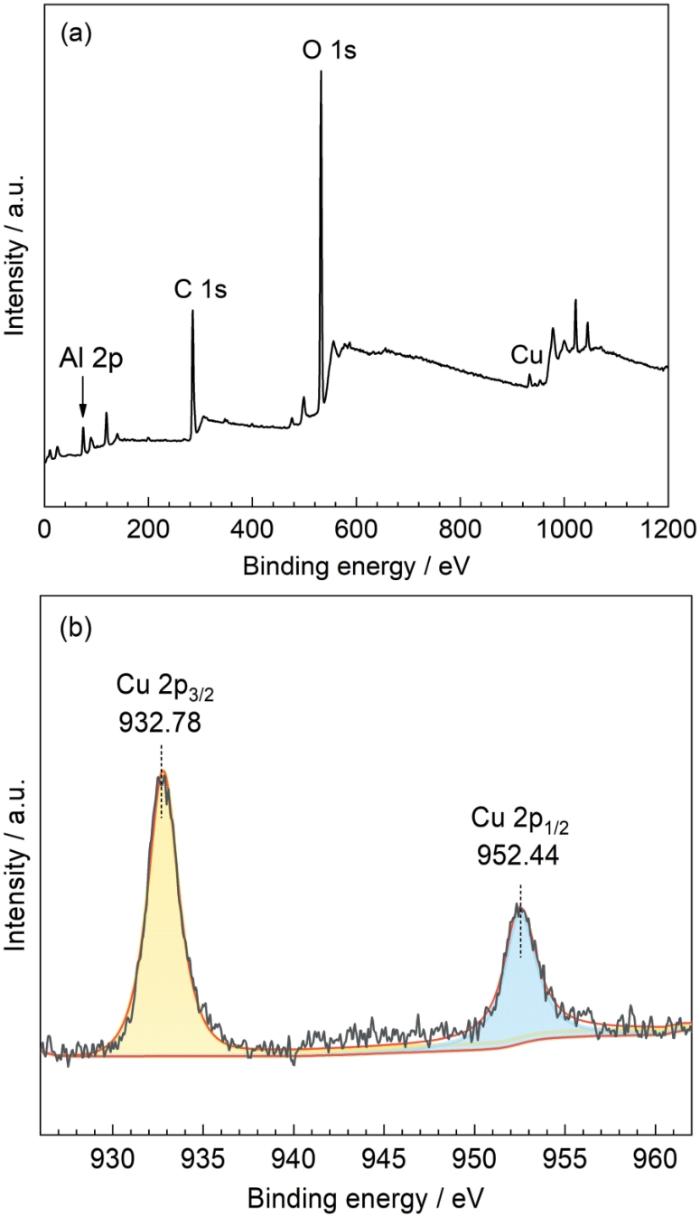 XPS full spectrum (a) and fine spectrum of Cu 2p (b) for coupled AA1060 Al-alloy immersed in 55% ethylene glycol aqueous solution for 30 d