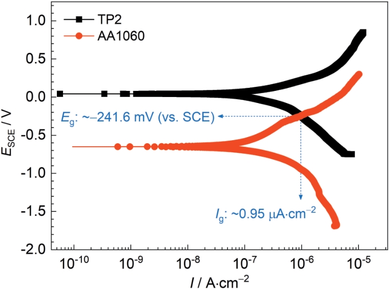 | 图2 TP2铜合金和AA1060铝合金在55%乙二醇的水溶液中的极化曲线 |
