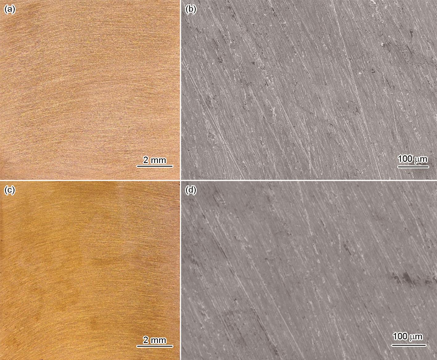| Fig.5 Surface morphologies of TP2 Cu-alloy soaked in 55% ethylene glycol aqueous solution for 30 d: (a, b) uncoupled sample, (c, d) coupled sample |