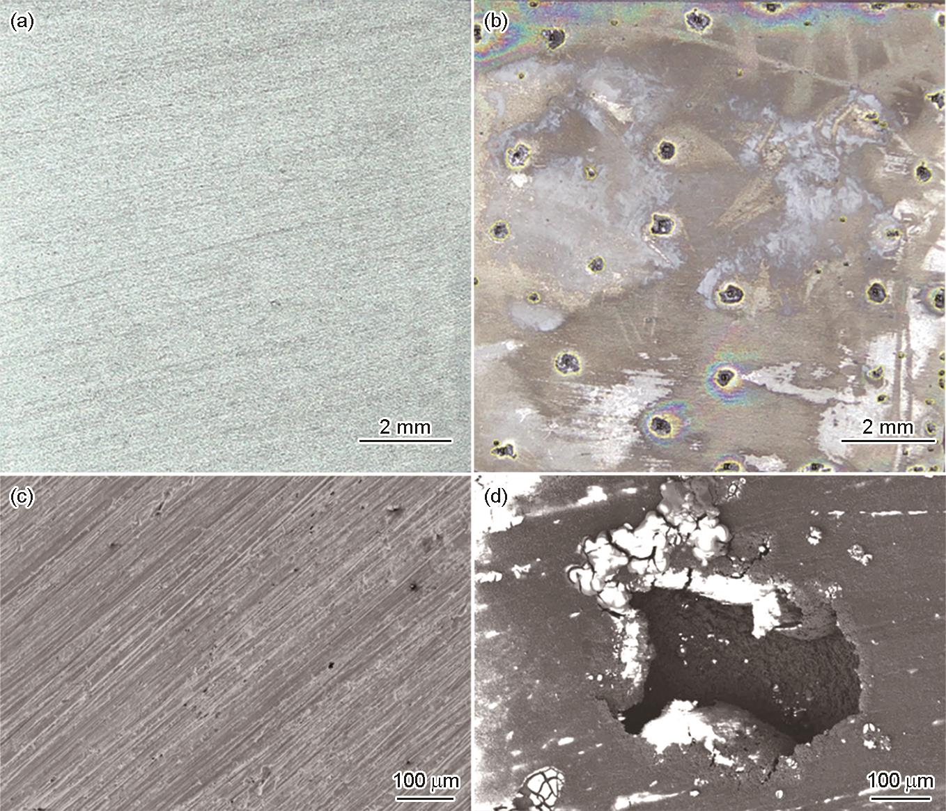 | Fig.6 Surface morphologies of AA1060 Al-alloy soaked in 55% ethylene glycol aqueous solution for 30 d: (a, b) uncoupled sample, (c, d) coupled sample |