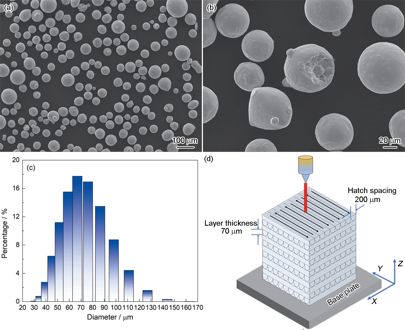 | Fig.1 Morphology, particle size distribution of metal powders, and schematic illustration of EBM additive manufacturing process: (a) low-magnification SEM image of metal powders; (b) high-magnification SEM image of metal powders; (c) particle size distribution histogram of powders, and (d) schematic diagram of the EBM process |