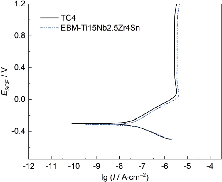 | 图9 TC4与EBM-Ti15Nb2.5Zr4Sn合金在模拟体液中腐蚀168 h后的动电位极化曲线 |