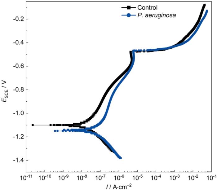 Potentiodynamic polarization curves of Al-Mg-Sc-Zr alloy after 14 d of immersion in the sterile and inoculated media