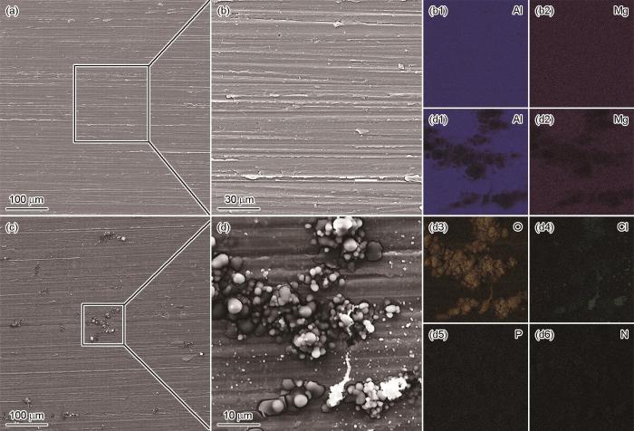 图6为14 d实验后,无菌和接菌环境中Al-Mg-Sc-Zr合金表面的SEM形貌以及EDS面扫描结果。对比图6b和d中形貌可见,该合金在无菌环境中几乎观察不到腐蚀的痕迹。然而,接菌环境中合金表面存在大量球状腐蚀产物,且周围分布着P. aeruginosa细菌细胞。图6b1和b2中的面扫描结果表明,无菌环境下合金表面均匀分布着Al(94.98%)和Mg (5.02%),这属于合金本身的元素成分。图6d1~d6的面扫描结果表明,合金表面的球状腐蚀产物主要由Al (67.49%)和O (27.69%)组成。此外,合金表面还分布着微量的N (0.09%)和P(0.41%),这两种元素可能由P. aeruginosa代谢产生。值得注意的是,接菌环境中合金表面还存在一些Cl,可能会对合金腐蚀产生不利影响。图中结果表明,生物膜不均匀覆盖在金属表面,导致局部电化学腐蚀差异。此外,Cl在腐蚀产物中可能如上述水解反应方程