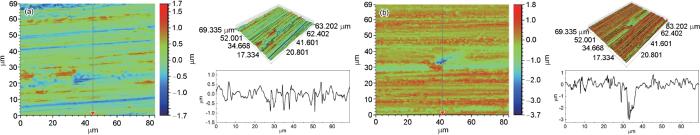 2D and 3D color images of the Al-Mg-Sc-Zr alloy surfaces after removal of corrosion products in the sterile medium (a) and in the inoculated medium (b)
