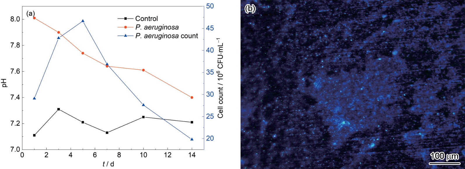 | Fig.3 Changes in pH value and cell counts of the test solution (a) and fluorescence images of P. aeruginosa cells on the Al-Mg-Sc-Zr alloy surfaces (b) |