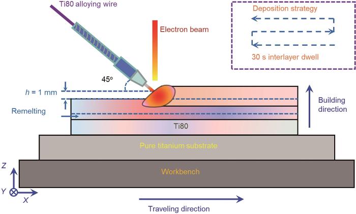 本文所采用的锻态Ti80合金(对照组)由西北有色金属研究院提供,实际化学成分符合Ti80合金名义成分[16]。电子束熔丝沉积所采用的原材料为T80合金丝,直径为1.6 mm,实际化学成分亦符合Ti80合金名义成分[7],所采用的基板尺寸规格为150 mm ×100 mm × 10 mm,具体工艺参数[17]:加速电压60 kV、束流密度40 mA、移动速度500 mm/min、送丝速度2 m/min。在进行电子束熔丝沉积增材制造之前,需对基板及丝材表面进行预处理:首先采用机械打磨消除表面氧化层,随后使用酒精进行超声清洗以去除污染物,最后将处理后的基板和丝材置于60 ℃的恒温干燥箱中进行3 h以上的预热处理,以降低热应力集中风险。图1为电子束熔丝沉积工艺过程的示意图。