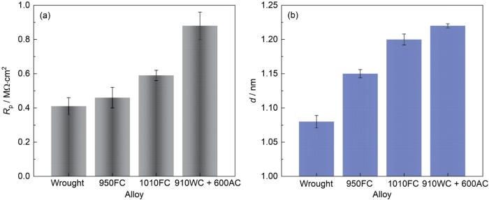 | Alloy | Rs / Ω·cm2 | CPEf / μS·s n ·cm-2 | nf | Cf / μF·cm-2 | Rf / MΩ·cm2 | χ2 / 10-4 | d / mm |