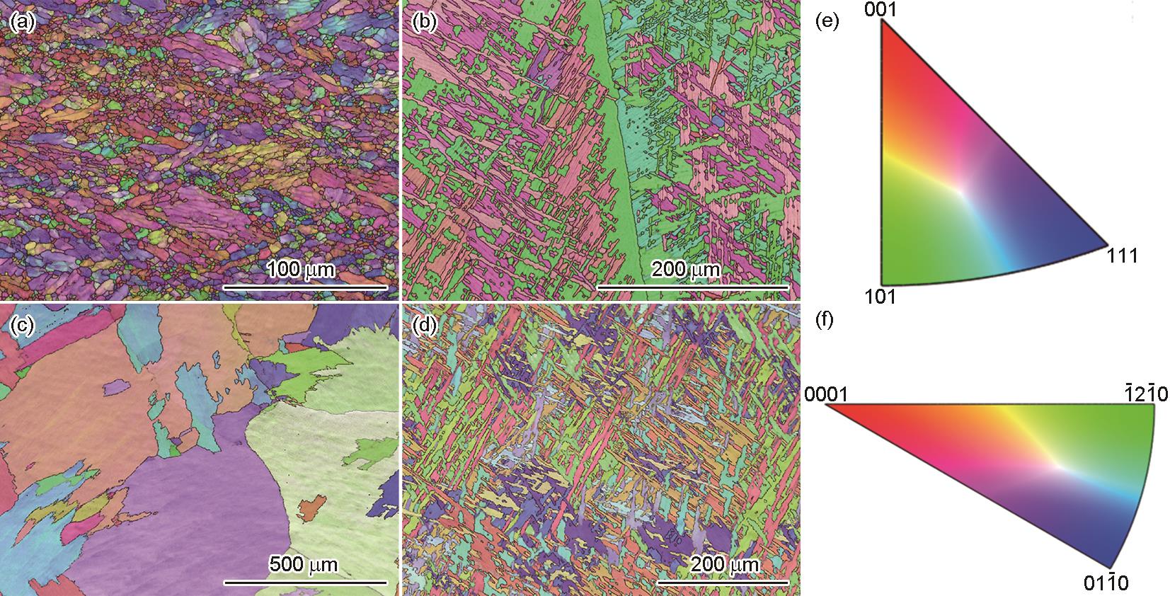 | Fig.5 EBSD IPF images of wrought Ti80 alloy and heat treated Ti80 alloys fabricated by EBF3: (a) wrought alloy, (b) 910WC + 600AC alloy, (c) 1010FC alloy[ |