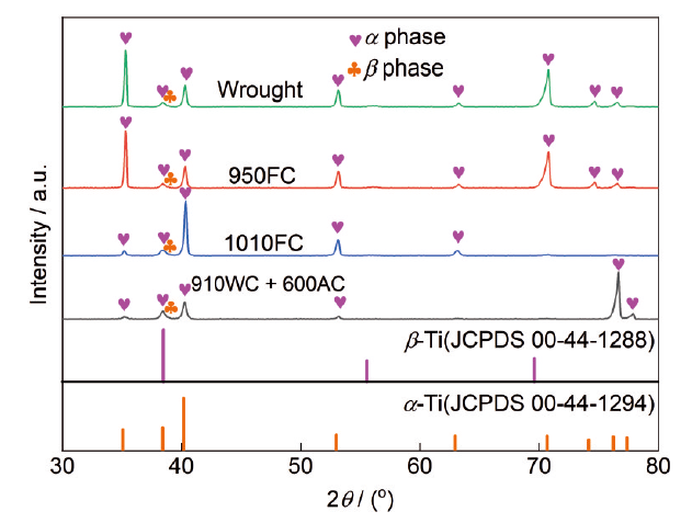 | Fig.2 XRD patterns of wrought Ti80 alloy and heat treated Ti80 alloys fabricated by EBF3 |