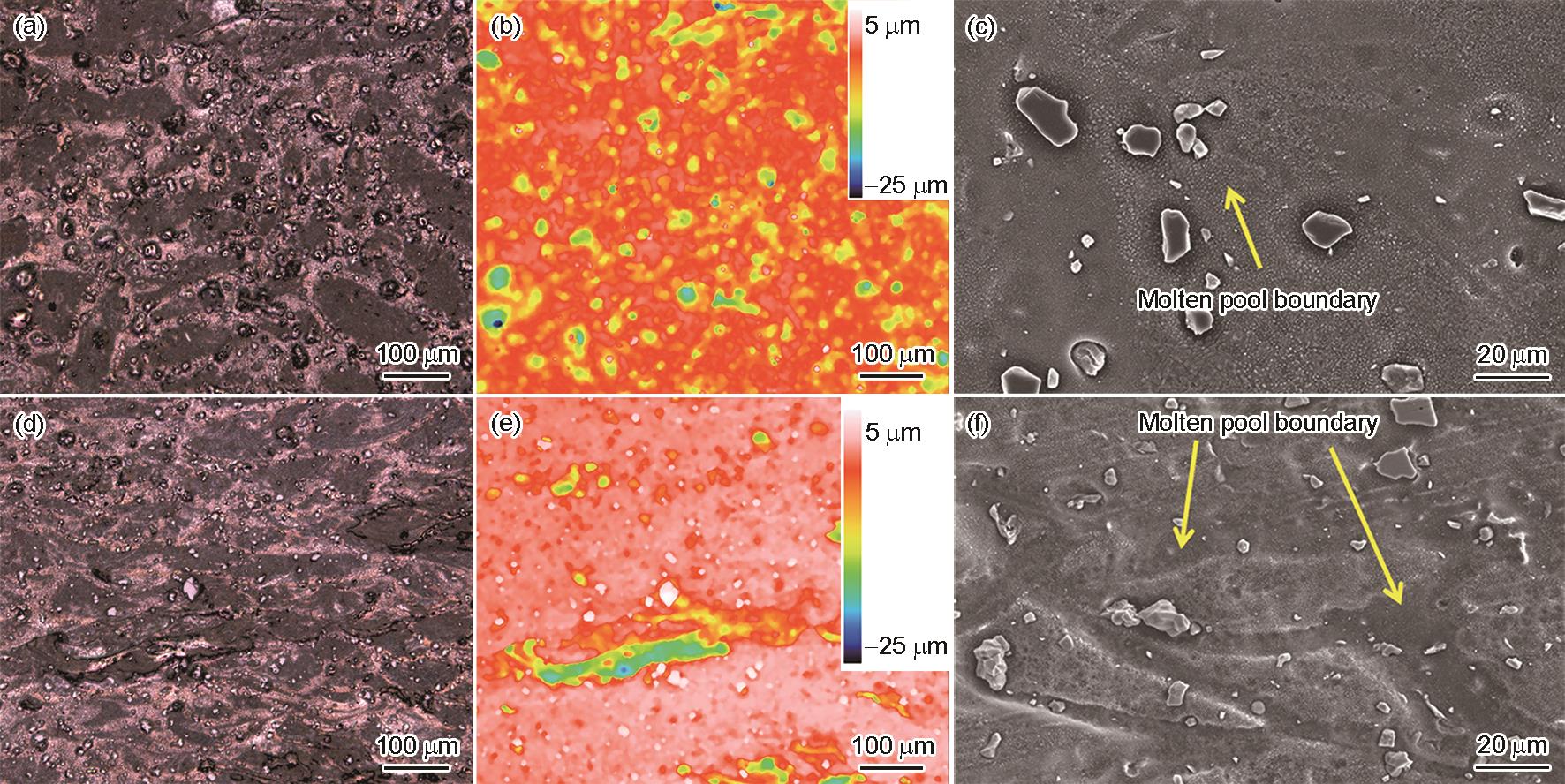 | Fig.5 CLSM images (a, b, d, e) and SEM images (c, f) of XY plane (a-c) and XZ plane (d-f) for LPBF TiC-modified Al-Mg-Sc-Zr alloy after immersion |