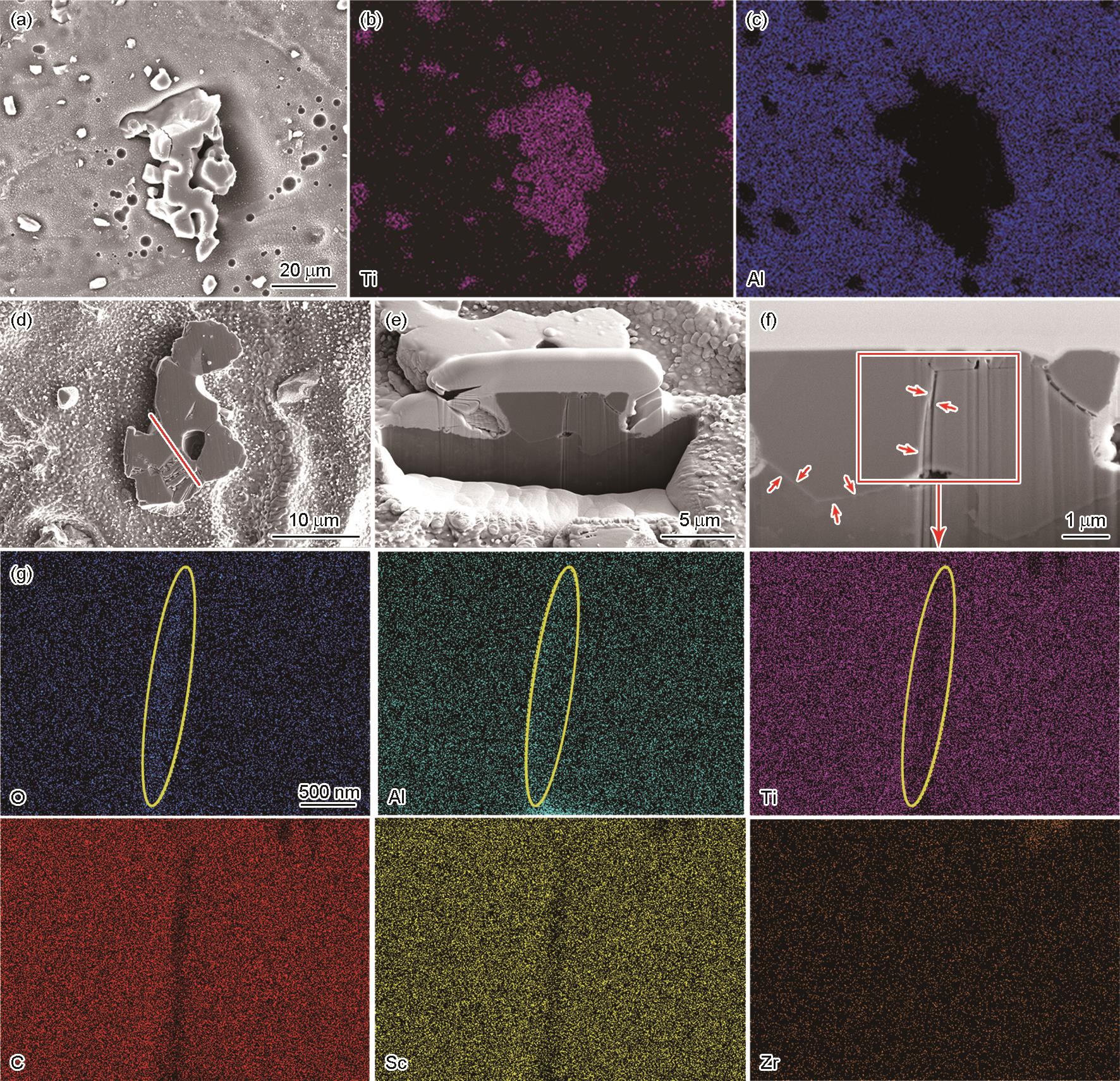 | Fig.6 SEM images (a), EDS results (b, c), FIB-SEM results (d-g) of micro-sized TiC particle in LPBF TiC-modified Al-Mg-Sc-Zr alloy |
